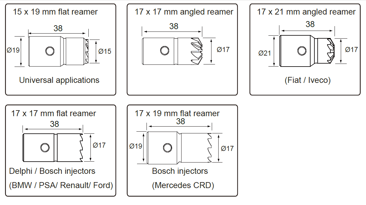• Includes a range of cutter sizes to accommodate a wide variety of injector seat designs across vehicle makes.